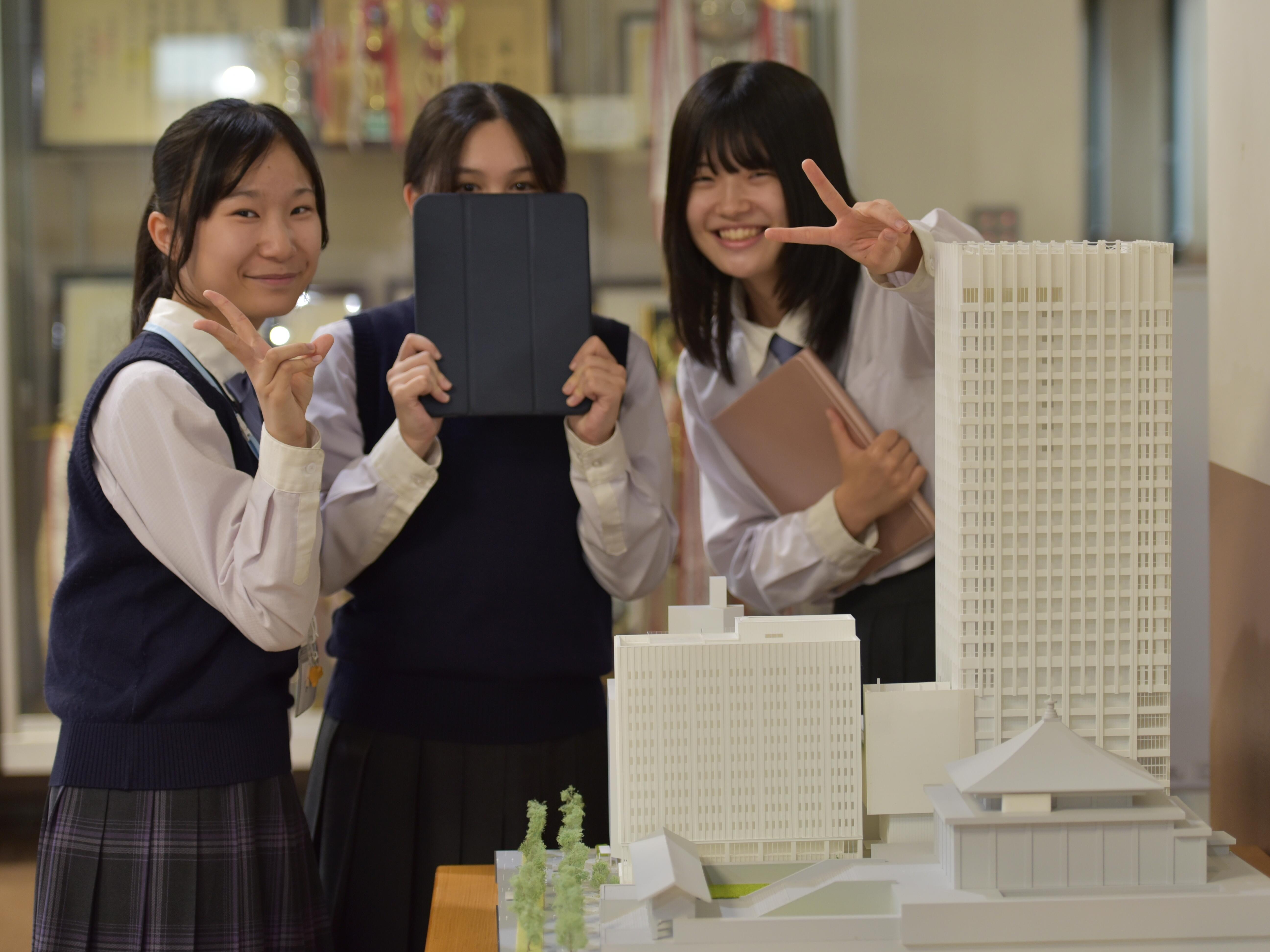 実は裏側では、隙間を狙って制服マネキンと戯れたり、模型を見て新校舎に胸を躍らせたりしてます。